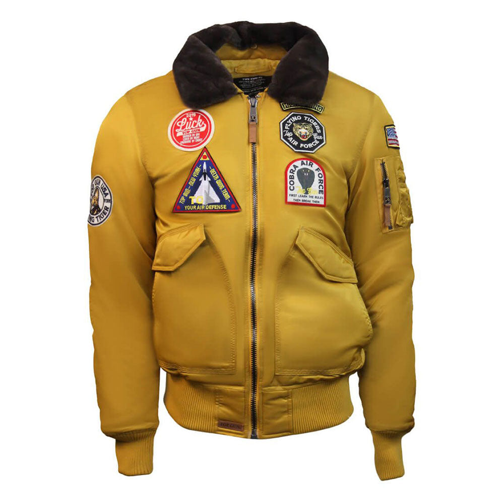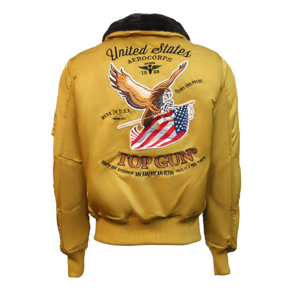 The Top Gun Eagle CW45 Bomber Jacket Wheat These Top Gun® bomber jackets are a must-have for the perfect Top Gun look. Pick a style of your choice and get noticed by your friends, made from 100 percent nylon, ribbed cuffs, collar and hem. This bomber jacket has a regular fit and runs true to size. The patches are Chenille and embroidery.