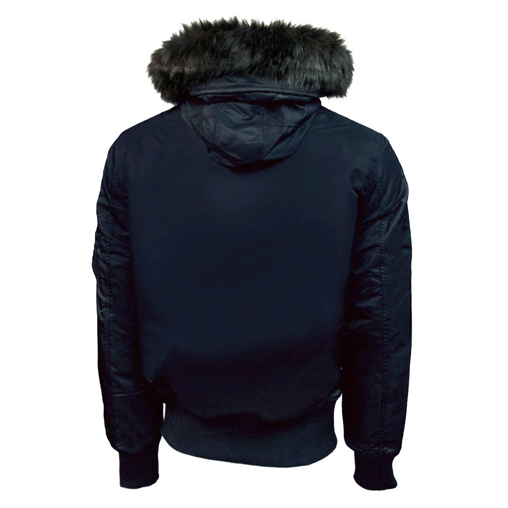 The Top Gun N-2B Bomber is inspired by the flight jacket worn by U.S. Air Force pilots during cold climates. You will be warm and comfortable in this satin-finish bomber, keep your hands cosy by placing them inside the fur-lined pockets. Ideal for any outdoor weather activities. This jacket features a 100 per cent nylon outer shell, removable drawstring hood, fur-lined pockets, ribbed cuffs and hem, removable faux-fur hood trim and two front pockets. This jacket has a regular fit and is true to size. Dry clean only.