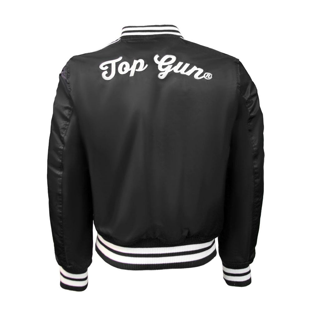 Top Gun The Flying Legend MA-1 Reversible Bomber Jacket Black. This Top Gun jacket is made with a 100% nylon outer shell and polyester interlining. It has a regular fit which runs true to size.